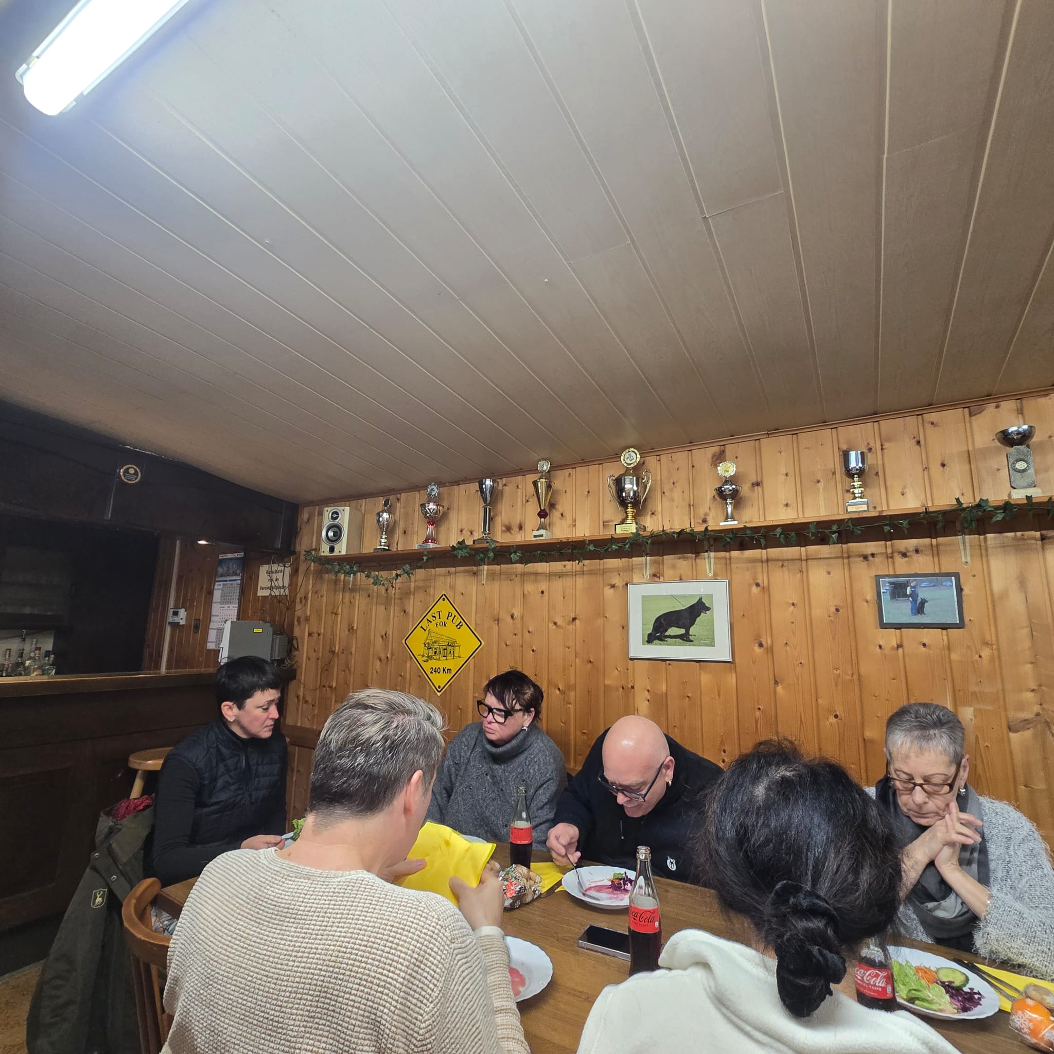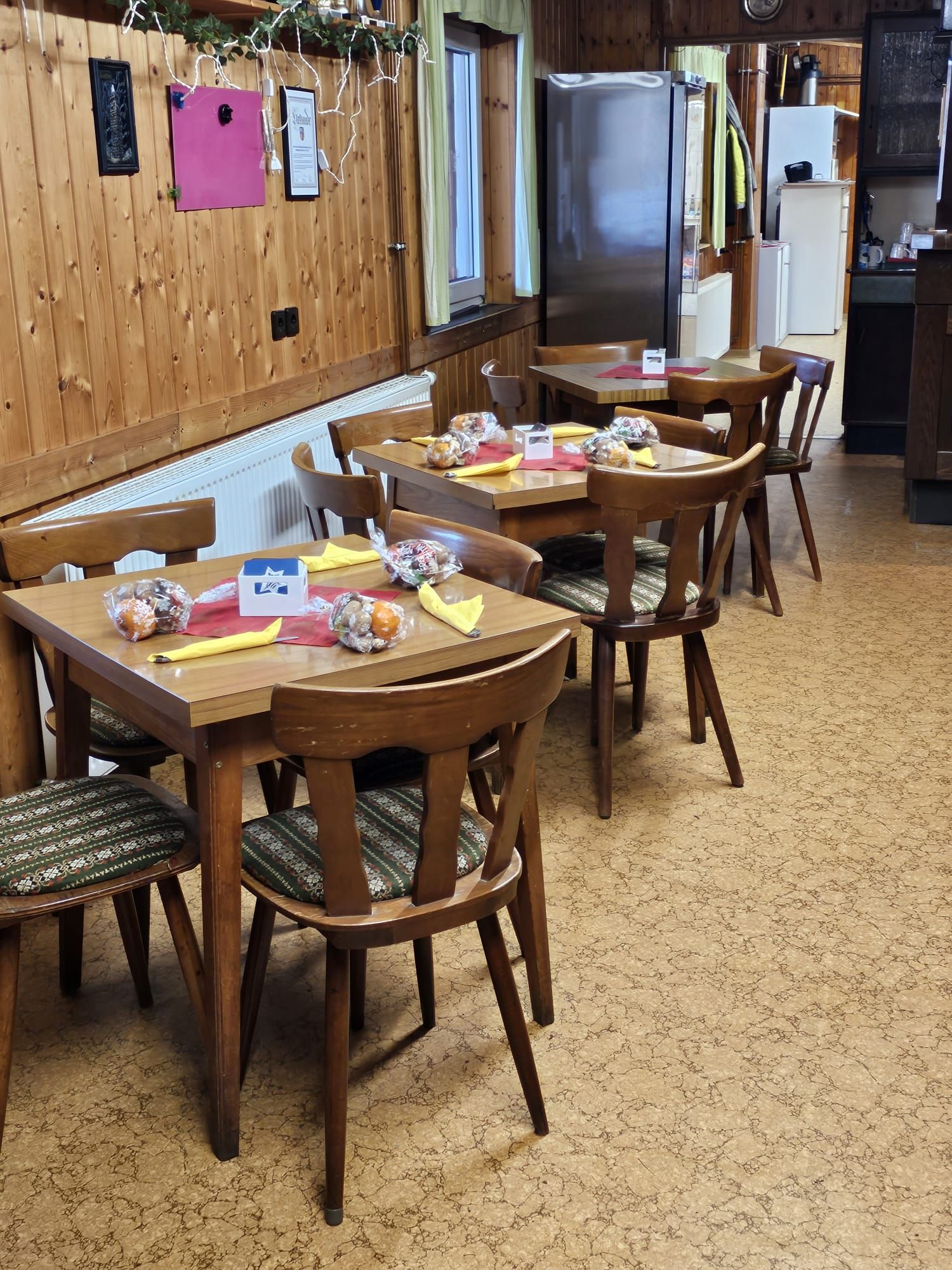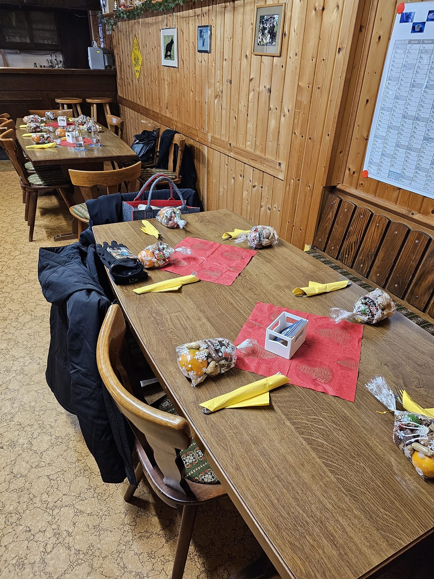 Birgit hat im Vereinsheim die Tische gedeckt und für jedes Mitglied eine zuvor gerichtete Weihnachtstüte dabei. Christiane war nicht mit zum Spaziergang, da sie eine bekannte Fotografin erwartete. In Absprache mit dem Vorstand hat Christiane sie nämlich zum Fotoshooting bei der LG Saarland eingeladen.