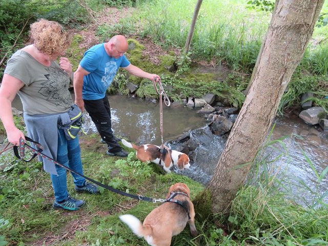 Wegen des Wetters liefen wir eine nicht so große Runde, die an einem Bach entlangführte. Unsere Hunde nahmen diese Abkühlung dankbar an und erfrischten sich, einige nutzen den Bach sogar um ein Bad zu nehmen.