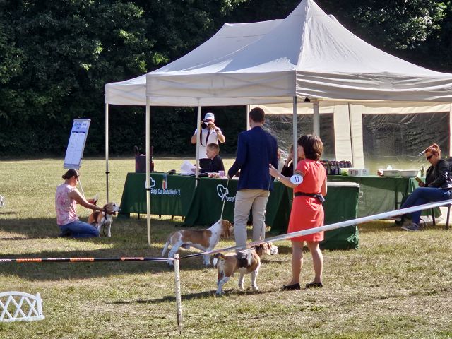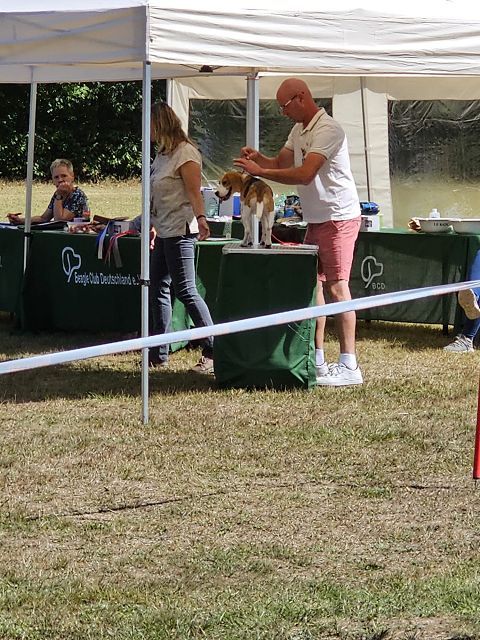 Danach erfolgte noch die Formwertbeurteilung. Bei den Hunden, die den Formwert über Ausstellungen gemacht haben, fehlte dann nur noch die Zahnkontrolle und es wurde die Widerristhöhe gemessen. Nach der Beratung der Richter konnten die Ergebnisse bekannt gegeben werden und jeder Teilnehmer bekam eine Tüte mit Leckereien für den Beagle. Herzlichen Glückwunsch an alle Teilnehmer, die die ZZP bestanden haben. Die Beagles durften natürlich auf dem eingezäunten Gelände noch ausgiebig toben und die Zweibeiner konnten bei leckerem Essen, Kaffee und Kuchen gemütlich zusammensitzen und es wurden interessante Gespräche geführt, bevor der erste Termin im September zu Ende ging.
